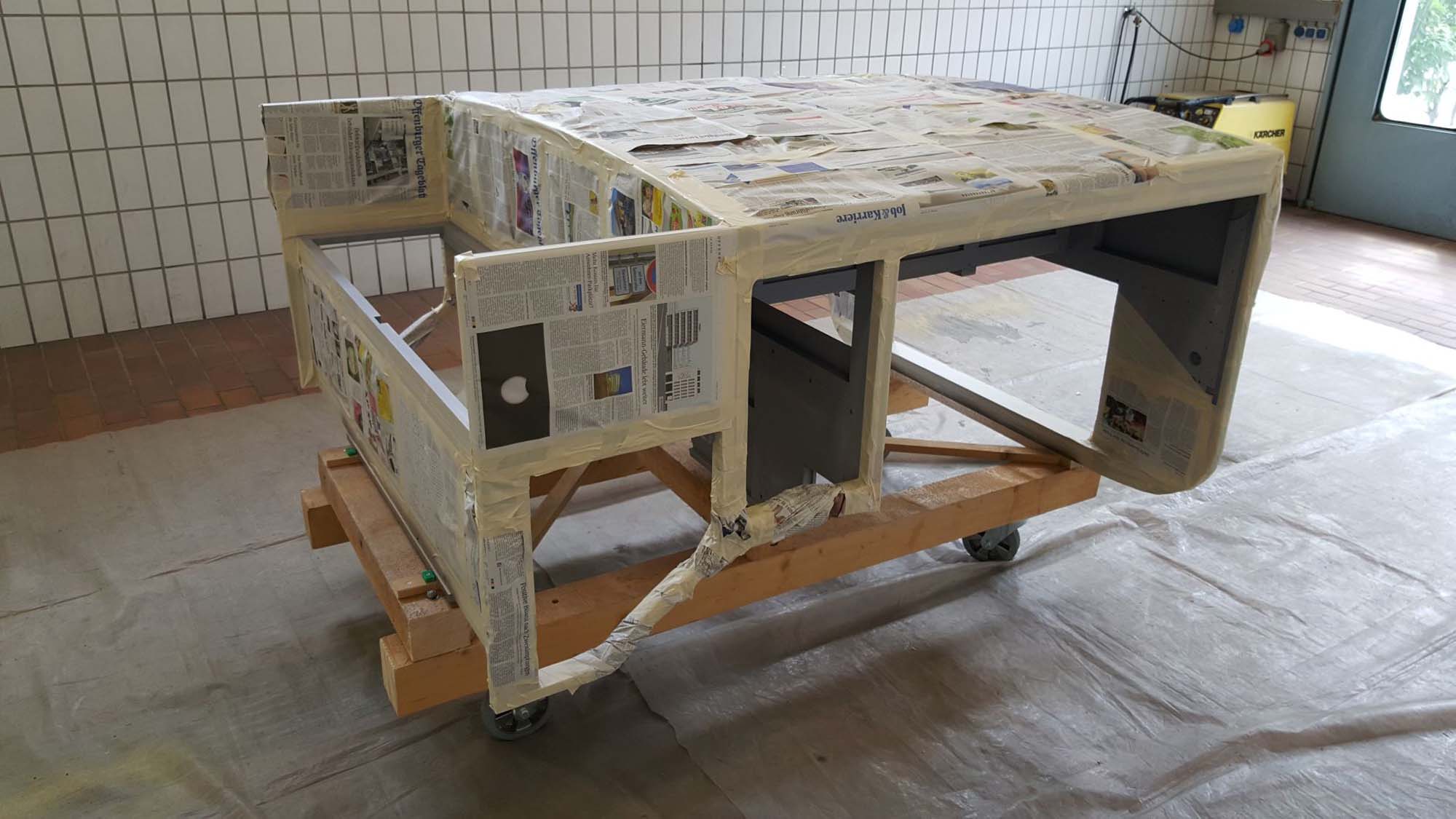Nach dem vorderen Teil des Aufbaus wurde nun auch der hintere Teil von Innen lackiert, während der vordere Teil schon seine rote Lackierung beim Lackierer bekommt.